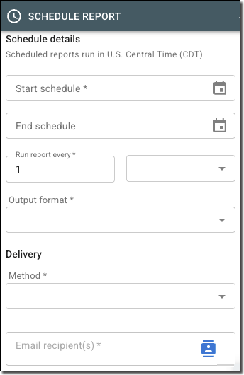All scheduled reports run in U.S. Central Time (CDT), so delivery times may vary based on your local time zone. Reports scheduled on the 30th or 31st will run on the last day of each month to to accommodate months with fewer days. If system maintenance or unexpected delays occur, your scheduled report may be delivered on a different date. No action is required—your report will automatically be sent once processing resumes.