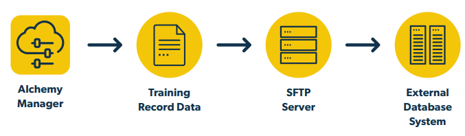 As diagrammed below, the Batch Export involves an export of user training data, then an SFTP upload, followed by an import of that data into an external database system. The process can involve several departments in your organization.