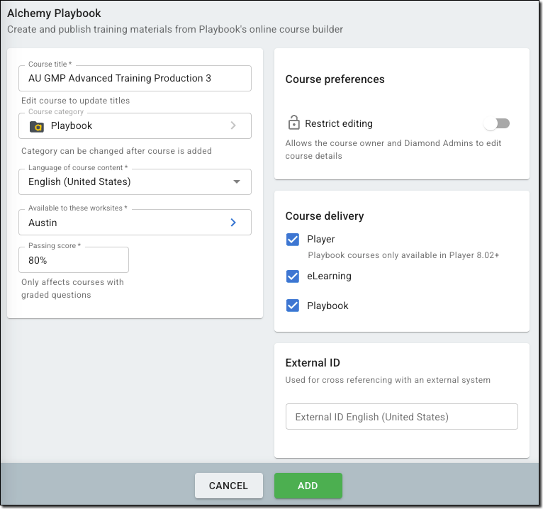 There are two ways to build a Playbook course: in Manager and in Playbook. This article discusses how to build a course in Manager. You can formally create and establish course language offerings other than English for content delivery using Alchemy Manager's Playbook Course Builder, refer to our Multi-language Course Builder Options article here. For information on how to build a course in Playbook, see How to Build a Playbook Course in Playbook.