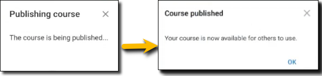 - The course will begin its publishing process and the app will display a series of confirmation messages: