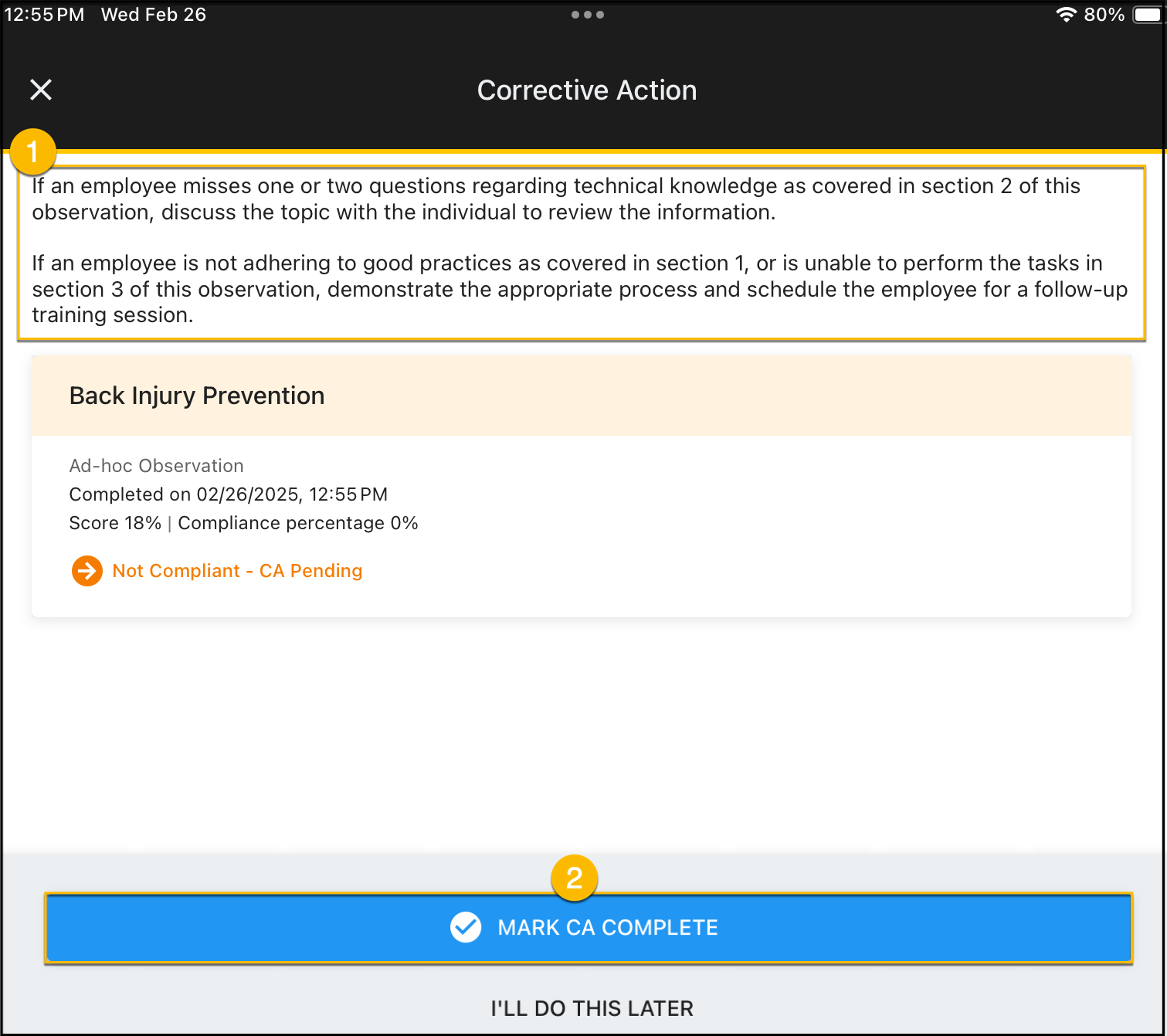 A corrective action will appear in App directly following an Observation that is marked Not Compliant. Pending corrections can also be found in the Quick Actions section of the Homepage.