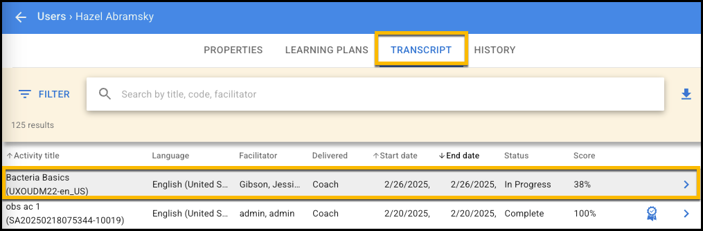 - Click on the status (i.e. In Progress) or score to open the Observation results.
