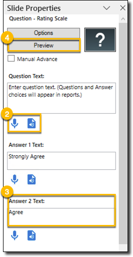 Rating Scale will auto-populate the answer text boxes with Strongly Agree, Agree, etc. They can be changed.