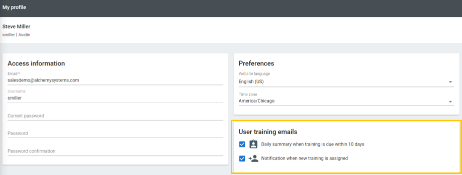 - There are two options under User training emails; uncheck the box or boxes next to the notifications you want to receive: