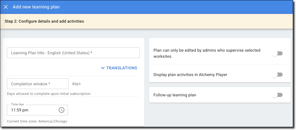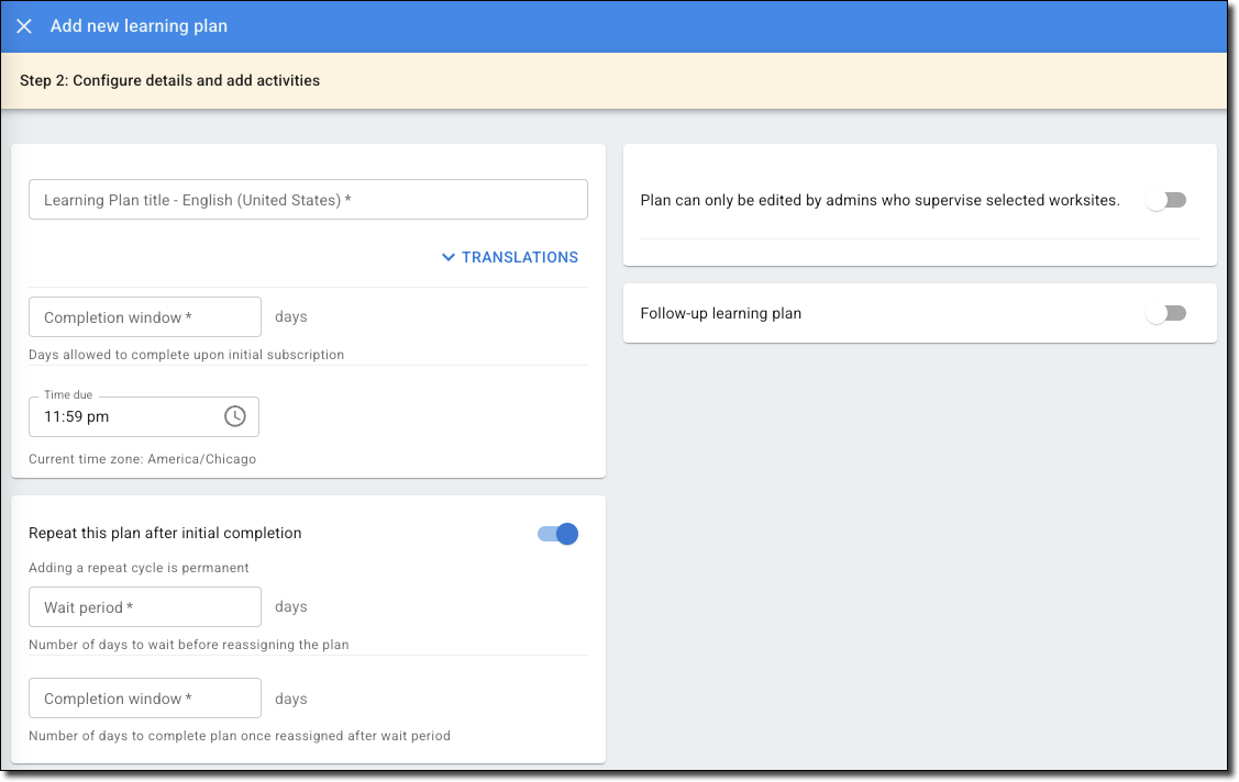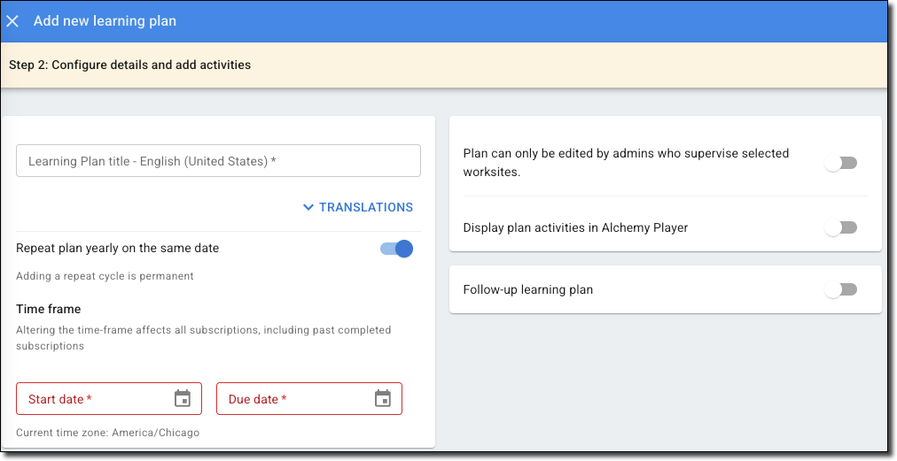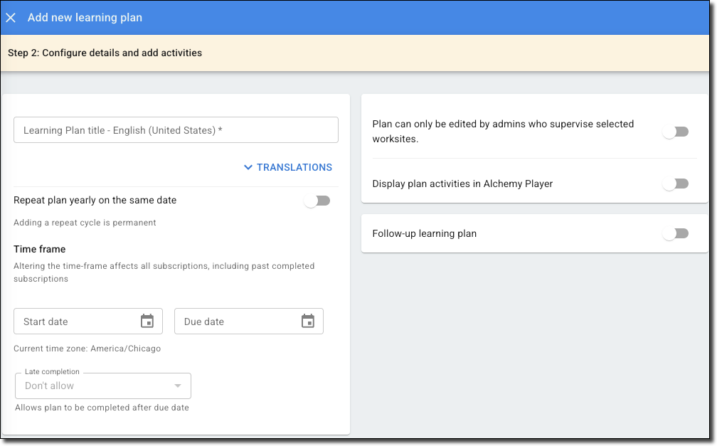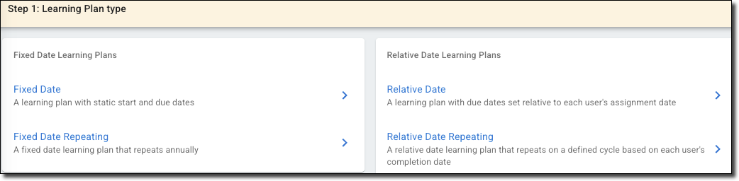 A Learning Plan with static start and end dates with the option to add a late completion window. It is the most flexible type of Learning plan to create and edit. If you are new to Learning plans, this is the best type to start with. To learn more, view the article Fixed Date Learning Plans.