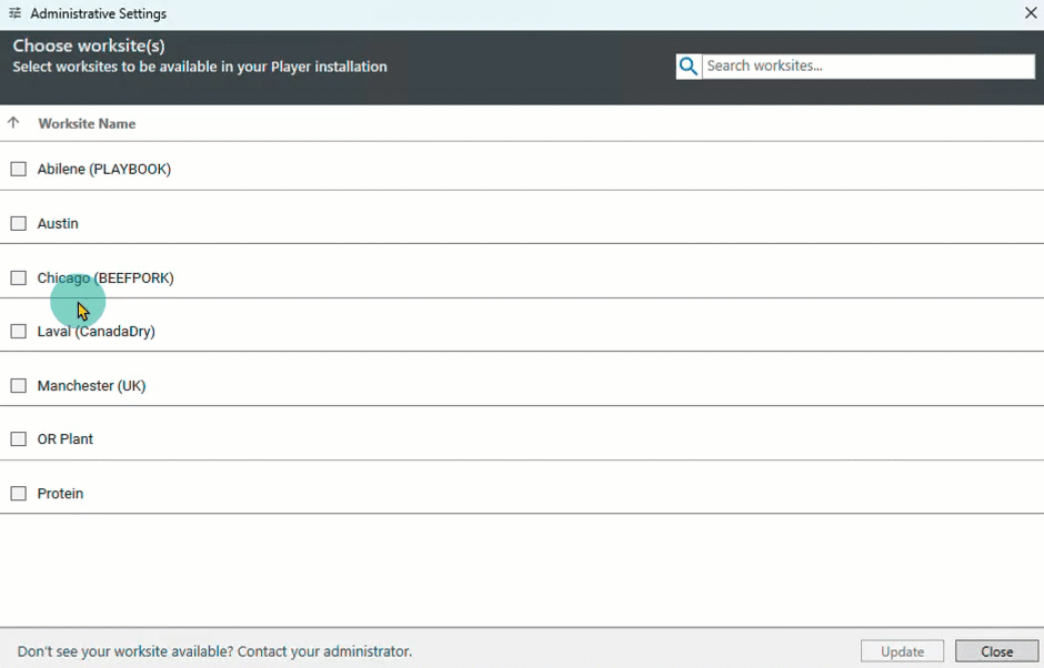 - Select the Worksites that should be available in Player. Select Update, then OK.