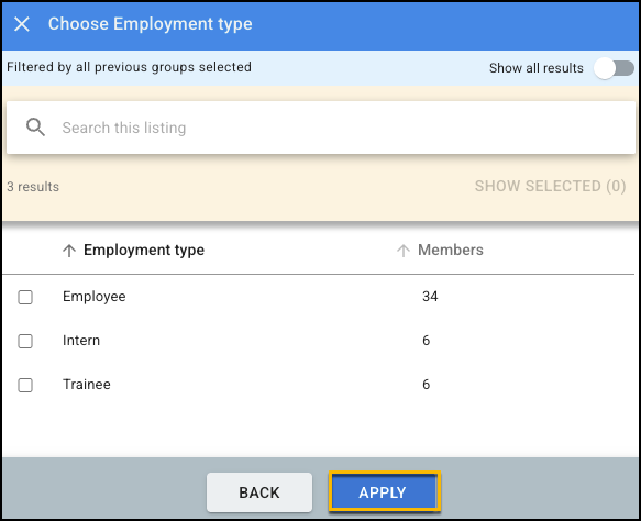 Note: For optimal performance, limit classification groups to 10 or less. - Select one or multiple sub-groups, then select APPLY.