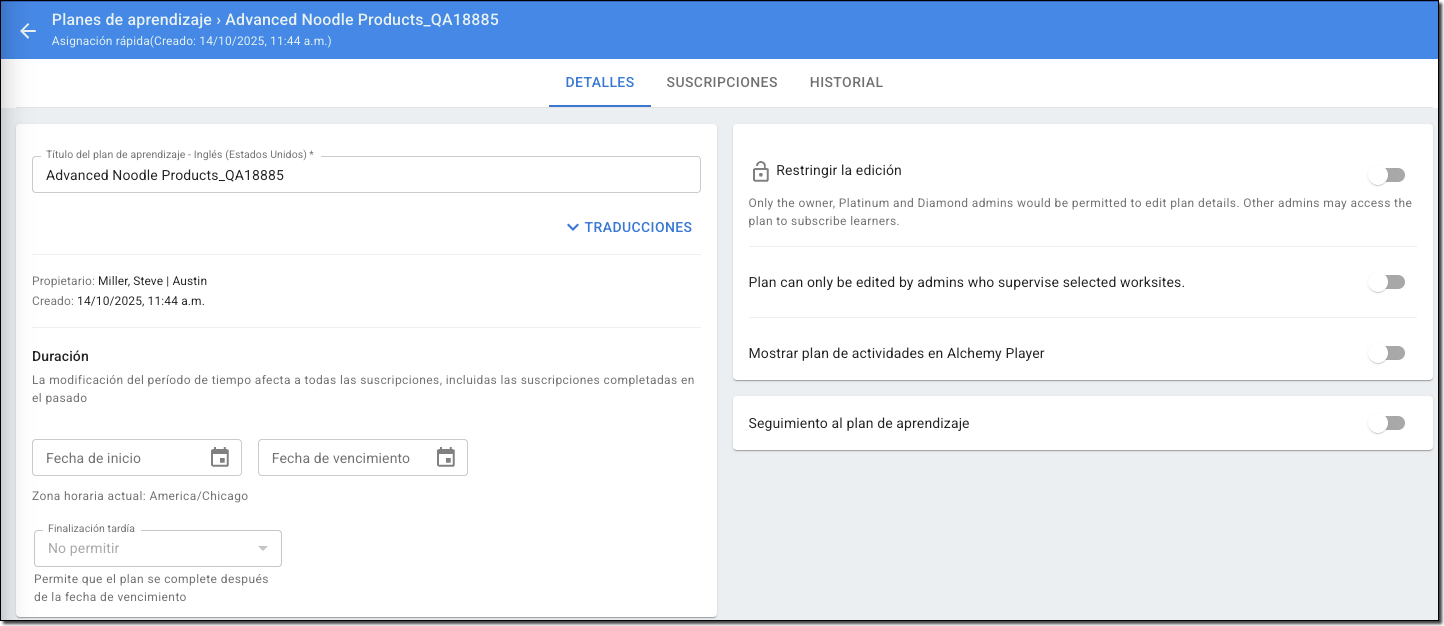 Después de seleccionar un Plan de Aprendizaje de Asignación Rápida para editarlo, verá la siguiente pantalla; para obtener instrucciones detalladas sobre cómo editar el título, añadir actividades adicionales y cómo suscribir grupos/sitios de trabajo al mismo, consulte Crear un nuevo plan de formación de fecha determinada.