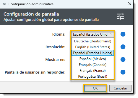 En el menú desplegable, seleccione el idioma deseado y, a continuación, OK.