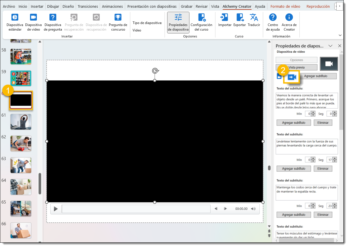Si quieres utilizar Alchemy Content, pero editarlo para adaptarlo a las necesidades de tu lugar de trabajo, es una gran opción exportar y editar vídeos. Por ejemplo, si quieres que alguien de tu centro de trabajo haga la voz en off. También podrá actualizar el texto de los subtítulos en las Propiedades de la diapositiva según sea necesario. Para editar vídeo necesitará una aplicación de edición de vídeo de terceros. Esto es opcional.