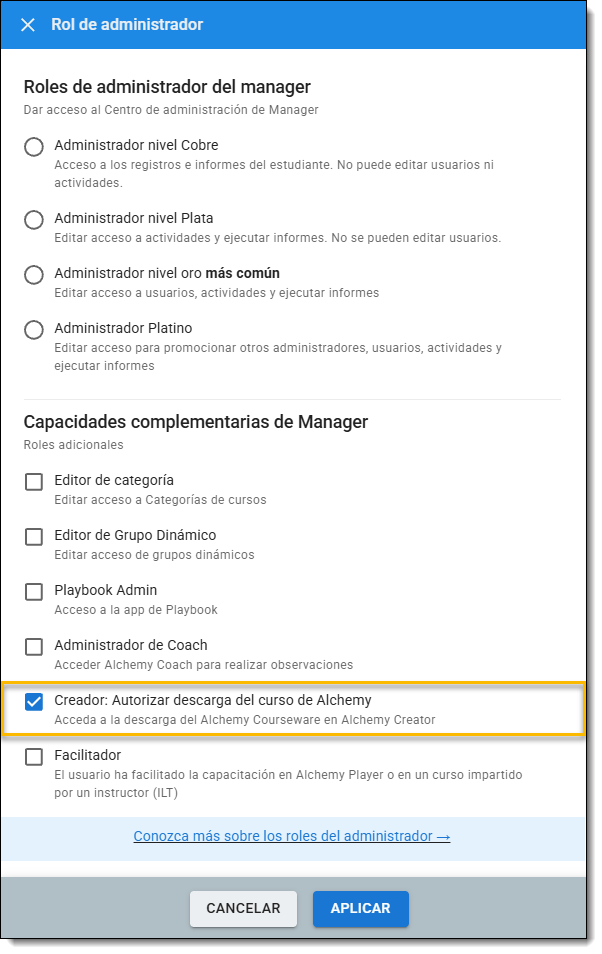 Si hay un curso de Alquimia que quieres utilizar pero te gustaría personalizarlo o traducirlo, puedes hacerlo en Creator. El contenido editable está disponible a través de una función de descarga habilitada para el inicio de sesión. El administrador que descarga el curso de Alchemy debe tener el rol de administrador de contenido de Creator. Este rol es SOLO para descargar y editar contenido de Alchemy. Todas las demás herramientas de Creator, incluida Translate, NO requieren este nivel de acceso.