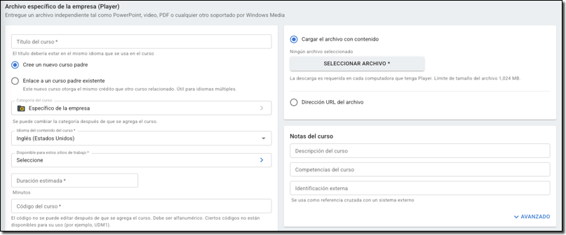 - En el menú Formato del curso, seleccione Archivo específico de la empresa (Player).