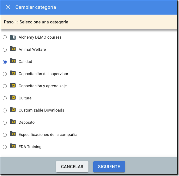 Nota: Los administradores de Alchemy pueden mover los cursos específicos de la empresa a los que tienen acceso a la categoría que deseen. Como práctica recomendada, Alchemy recomienda comunicar cualquier cambio de categoría a todos los afectados.