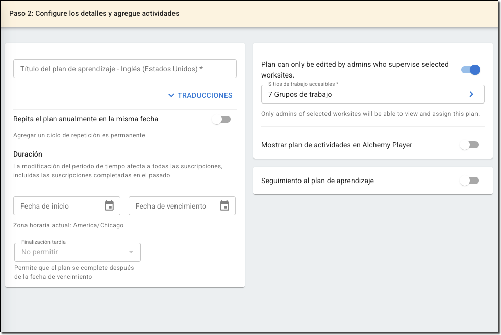 - Opcional: Se pueden añadir horas a las fechas de Inicio y Vencimiento (Establecer en la zona horaria del administrador que creó el Plan de Aprendizaje).