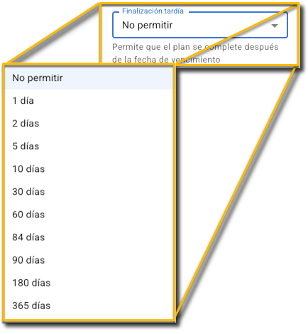 Opcional: Añada una ventana de finalización tardía para disponer de tiempo adicional para recibir un estado de finalización después de la fecha de vencimiento inicial de los Planes de formación.
