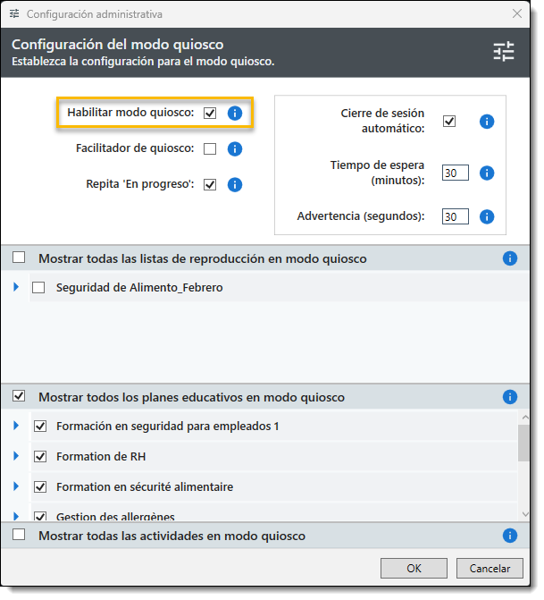 Mostrar todas las actividades en el quiosco: Seleccione para que todas las actividades de capacitación (Cursos, Pruebas, Evaluaciones) estén disponibles en Modo Kiosco.