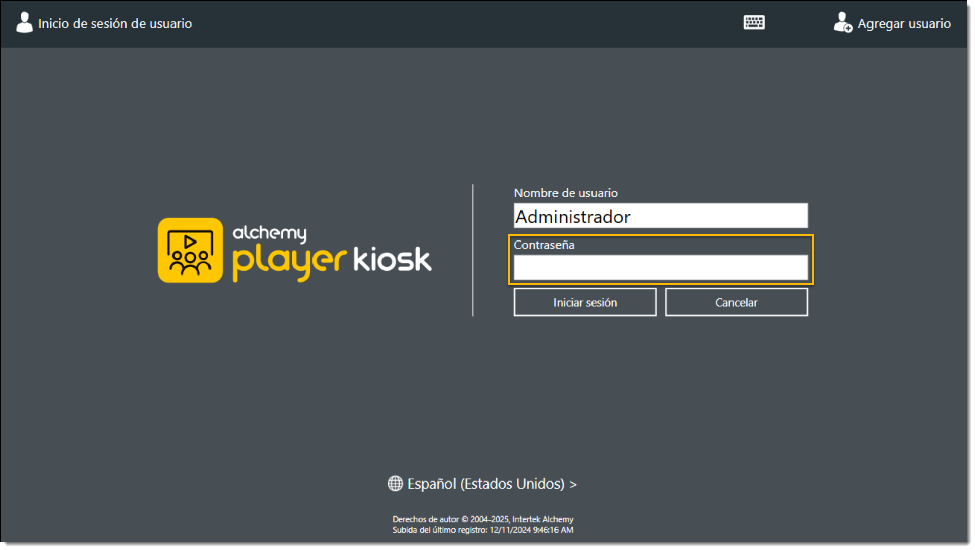 Inicie sesión con su contraseña de administrador (contraseña por defecto: alchemy)