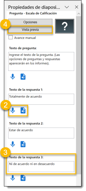 Escala de valoración rellenará automáticamente los cuadros de texto de respuesta con Totalmente de acuerdo, De acuerdo, etc. Se pueden cambiar.