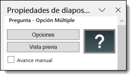 La diapositiva de la pregunta será una pregunta de tipo Opción Múltiple, vea Cambiar Tipo de Pregunta para otras opciones.