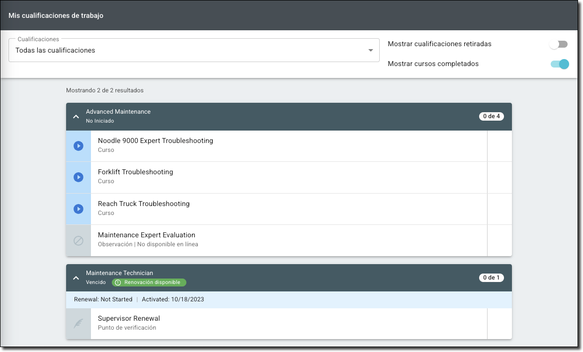 Para ver sus cualificaciones laborales asignadas, vaya a la pestaña Mis cualificaciones laborales en el menú de la izquierda. Aquí puede ver las cualificaciones por estado: en curso, cualificado/provisionalmente cualificado en renovación, no iniciado, cualificado, provisionalmente cualificado, caducado y revocado. Las renovaciones de las cualificaciones aparecen al principio de la ventana de renovación.