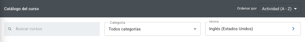 - Puede buscar un curso o tema específico introduciendo un término en el campo Buscar cursos, o seleccionando en los menús Categoría o Idioma