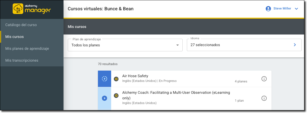Nota: Tiene la posibilidad de elegir el idioma en el que desea ver el sitio web de Manager eLearning. También puede filtrar los cursos por idioma preferido.