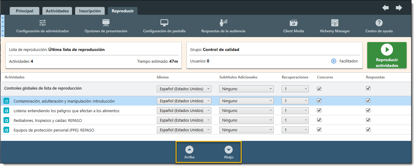 Nota: Las actividades de capacitación en Player se reproducirán de arriba a abajo. El orden en que se presentan las actividades de una lista de reproducción puede ajustarse antes de comenzar el entrenamiento.