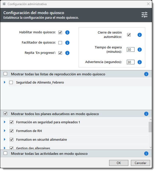 Mostrar todas las actividades en el quiosco: Seleccione para que todas las actividades de capacitación (Cursos, Pruebas, Evaluaciones) estén disponibles en Modo Kiosco.