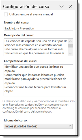 La configuración del curso en Creator es una parte importante de su curso Creator. Esta información se muestra en Player para la formación en grupo. La descripción de su curso, las competencias del curso y el Idioma del curso se establecen en Configuración del curso. Por defecto, se pedirá a los usuarios que designen el nombre del curso y el idioma al exportarlo.
