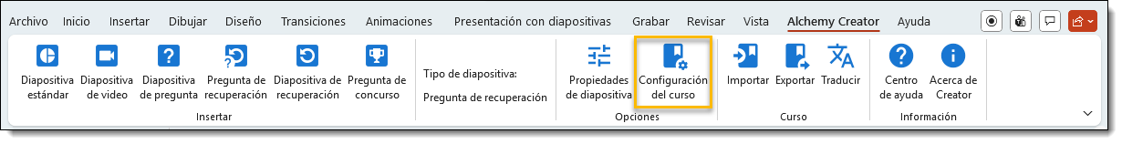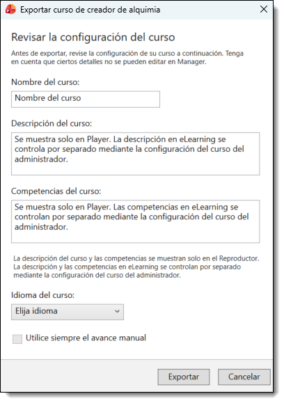 Aparecerá la ventana de configuración del curso. Revise y asegúrese de que se ha completado cada componente. Nombre del curso e Idioma del curso son campos obligatorios. Cuando haya terminado, seleccione Exportar.