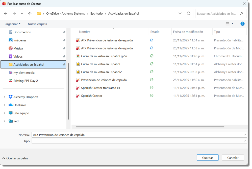 El nombre del archivo será de forma predeterminada el nombre de PowerPoint con la extensión.sistem.
