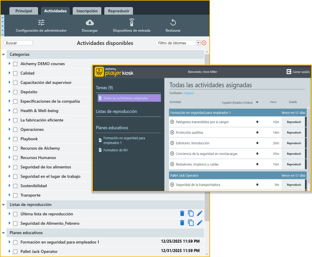 La descarga de listas de reproducción del Plan de aprendizaje a Player requiere trabajar con dos componentes: Alchemy Manager y Alchemy Player. Los pasos siguientes identifican cuándo y cómo utilizar ambos componentes para realizar esta función.