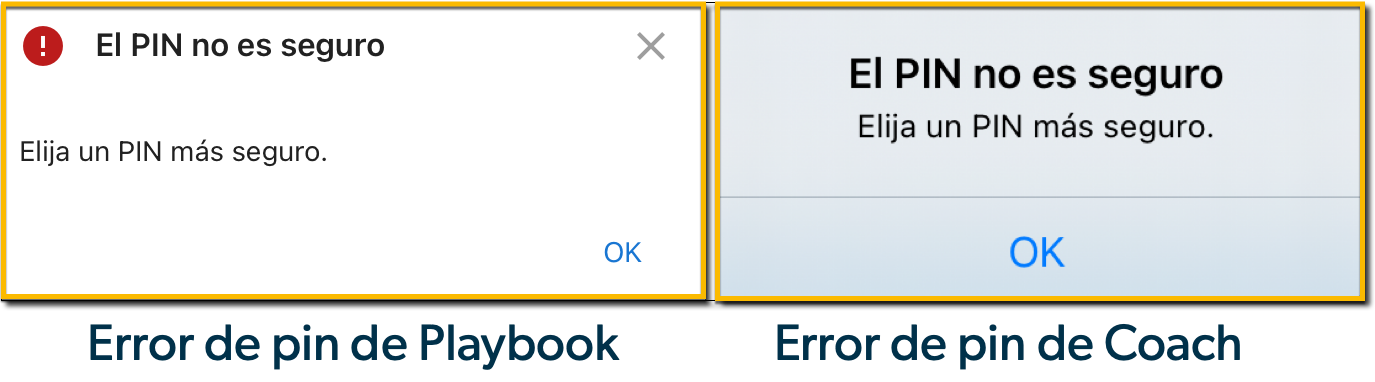 Nota: Este artículo enumera todos los requisitos de PIN para Coach y Playbook. Recibirás un error en la aplicación si tu contraseña no cumple los requisitos de seguridad de Alchemy.