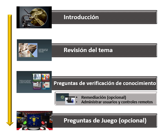 A continuación se muestra un diagrama de un curso típico de Alquimia. Los cursos de alquimia emplean técnicas de "prueba en la formación". Se formulan preguntas a lo largo del curso a medida que se cubren las competencias. Los cursos de Alchemy requieren una puntuación de aprobado del 100% y contienen preguntas opcionales de Remediación si usted elige dar a sus participantes de formación oportunidades adicionales para proporcionar una respuesta correcta. Los cursos de Alchemy pueden importarse a través de Creator y editarse según sus propias especificaciones.