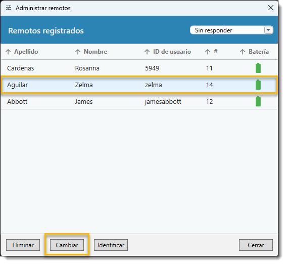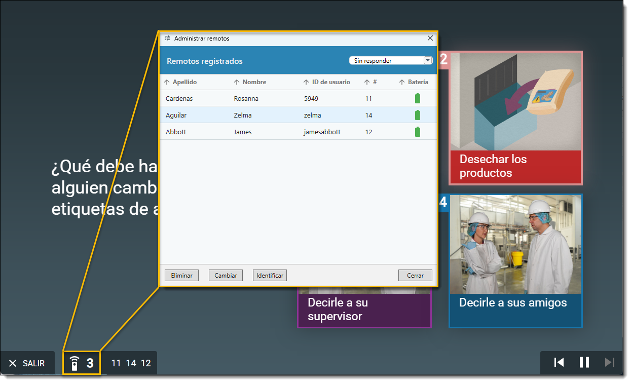 Si un usuario tiene problemas con un mando a distancia antes o durante una sesión de formación, incluso si la pila se está agotando, lo mejor es cambiarlo. En mitad de la sesión, los mandos a distancia pueden cambiarse en una pantalla de preguntas y respuestas.