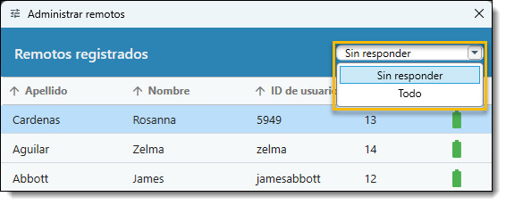 Si un moderador desea ver quién no ha contestado específicamente, puede hacerlo desde la ventana Gestionar remotos.