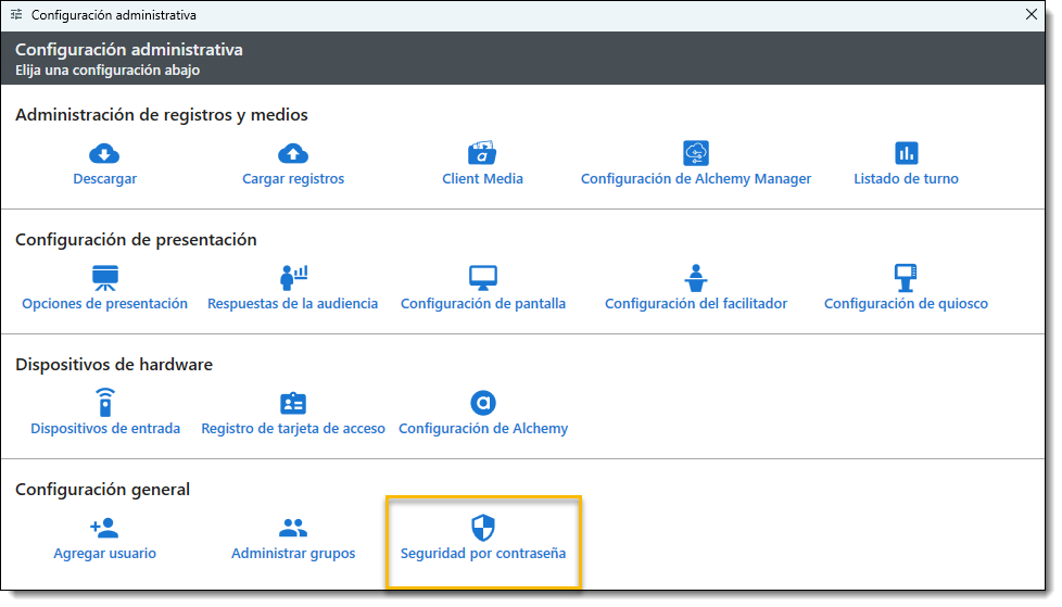Nota: La contraseña para acceder a ciertas funciones administrativas puede cambiarse si es necesario. Se recomienda encarecidamente cambiar la contraseña la primera vez que se utilice Player.