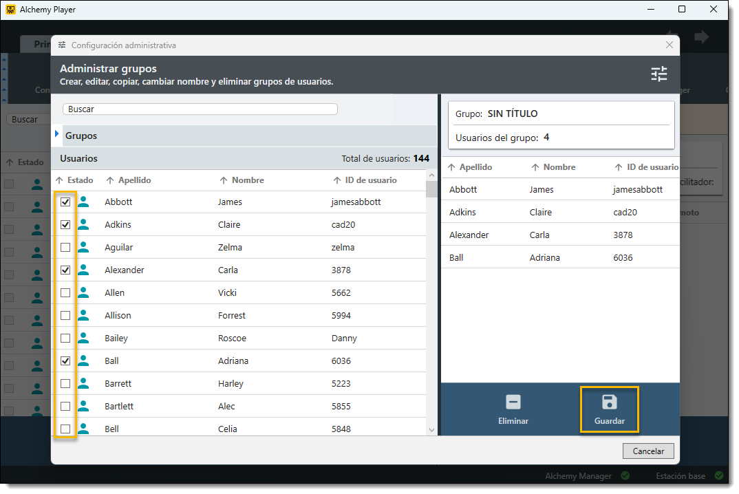 - Para añadir un usuario al grupo, marque la casilla situada junto al nombre de una persona en la lista de usuarios