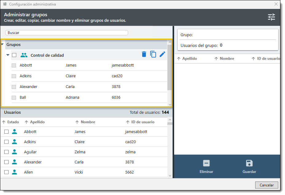 - Para eliminar a un usuario de un grupo, seleccione el nombre de la persona que desea eliminar del grupo y, a continuación, haga clic en el botón Eliminar