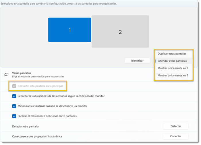- Busque el menú desplegable Múltiples pantallas. Seleccione Extender estas pantallas.