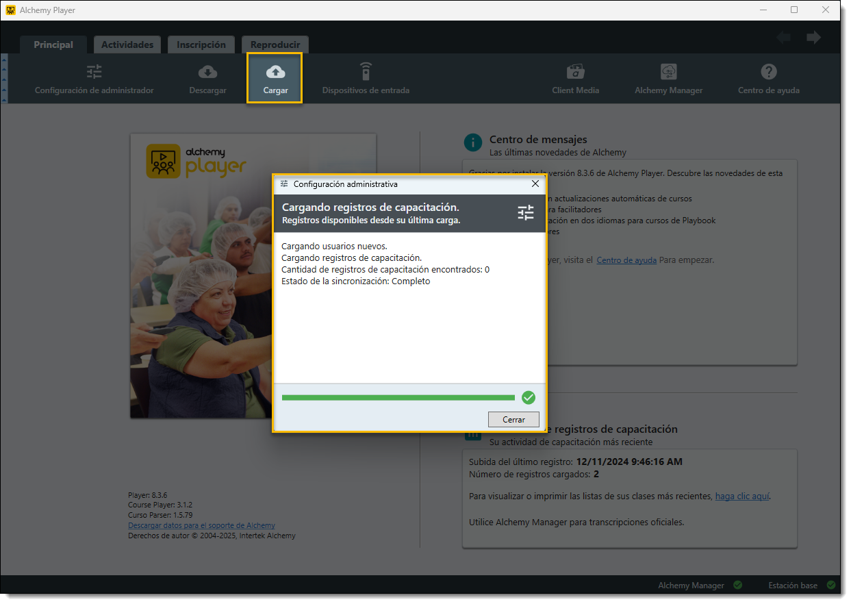 Nota: Cuando el Reproductor no detecta una conexión activa a Internet durante una sesión de entrenamiento, el programa guarda los datos de entrenamiento y los nuevos usuarios en archivos de copia de seguridad en ese equipo. Para acceder a estos registros de entrenamiento y a la información de los nuevos usuarios en el sitio web del Administrador, deberá cargar dichos registros manualmente desde el Reproductor.