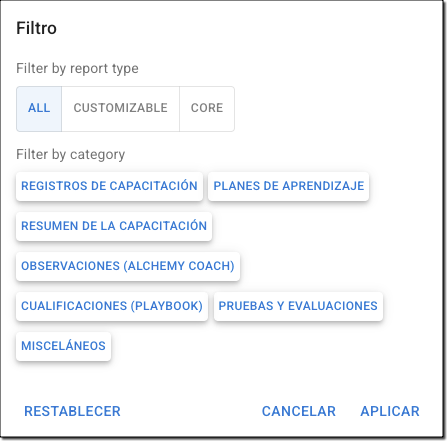 Elija cualquier combinación de tipo de reporte y categoría, luego seleccione APLICAR.