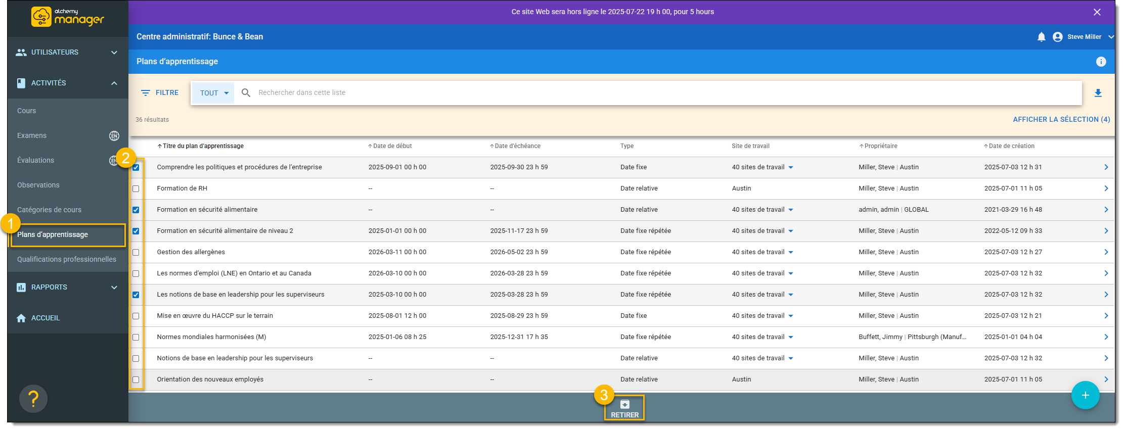 Remarque: seules les personnes disposant d'un accès administrateur Diamant peuvent effectuer des retraits groupés de plans de formation.