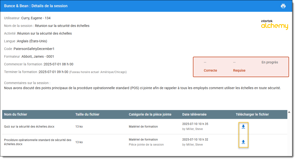 - Dans le coin inférieur gauche, vous pouvez voir les pièces jointes de la session qui sont associées à toutes les personnes inscrites à la session ILT.