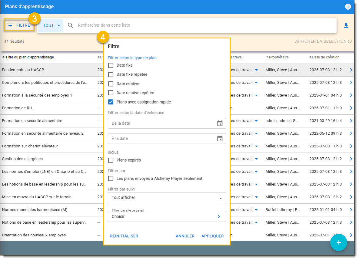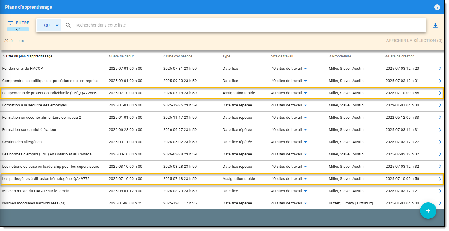 Si vous avez sélectionné plusieurs plans de formation dans le filtre, vérifiez la colonne Type pour confirmer qu'il s'agit bien d'un plan de formation à attribution rapide.