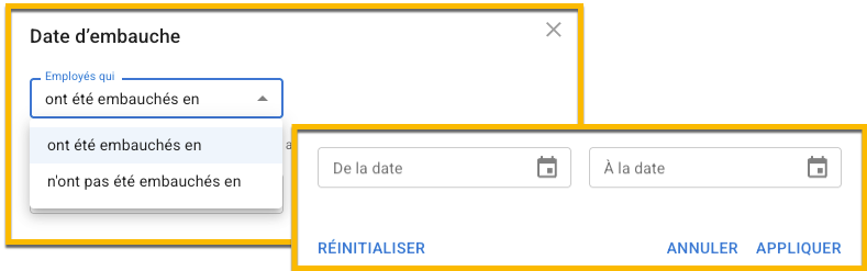 - Utilisez seulement la date Du pour filtrer les employés embauchés à cette date ou après.