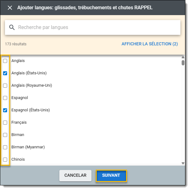 - Sélectionnez les langues que vous souhaitez voir traduites. Après avoir fait vos choix, cliquez sur SUIVANT.