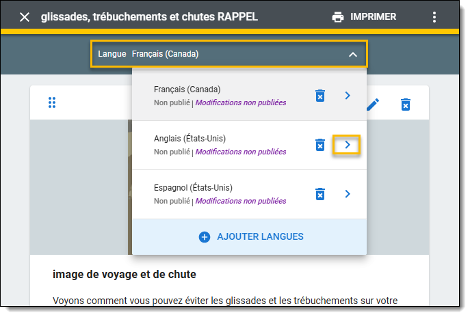 - En haut au centre de votre écran, cliquez sur la sélection déroulante Langue. Cliquez ensuite sur Ajouter des langues.