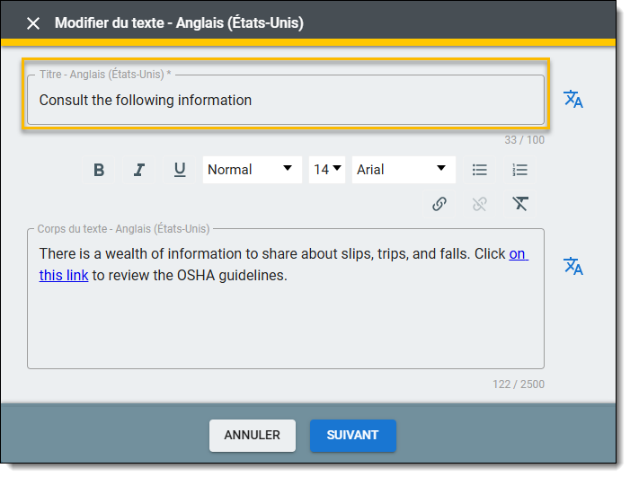 Le générateur de cours multilingues offre un excellent moyen de faciliter la formation en deux langues. Pour cette fonctionnalité du Playbook, Alchemy utilise AWS pour les services de traduction de texte. Alchemy suggère les meilleures pratiques suivantes lors de la traduction du contenu de la formation afin d'en garantir l'intégrité.