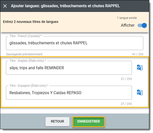 - Votre cours sera traduit automatiquement et les titres du cours apparaîtront dans les langues traduites. Cliquez sur SAUVEGARDER
